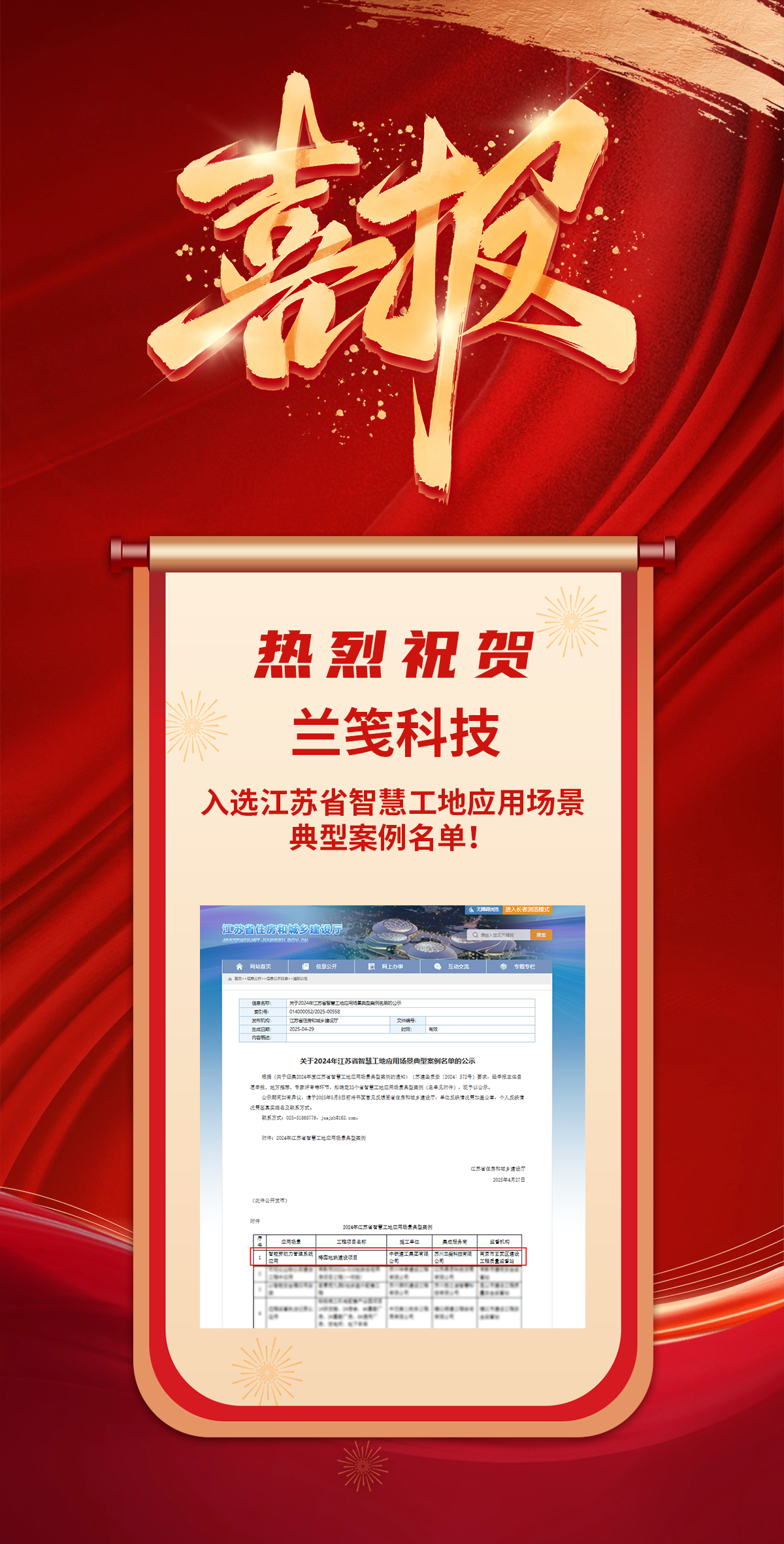 喜報!熱烈祝賀蘭箋科技入選江蘇省智慧工地應用場景典型案例名單!